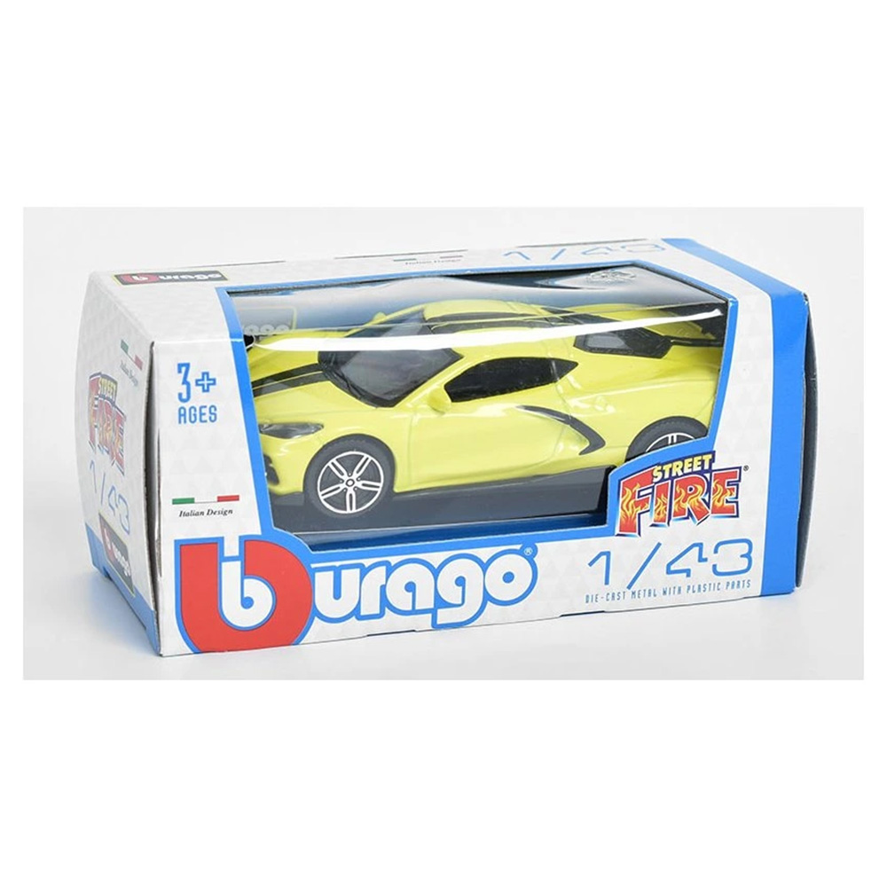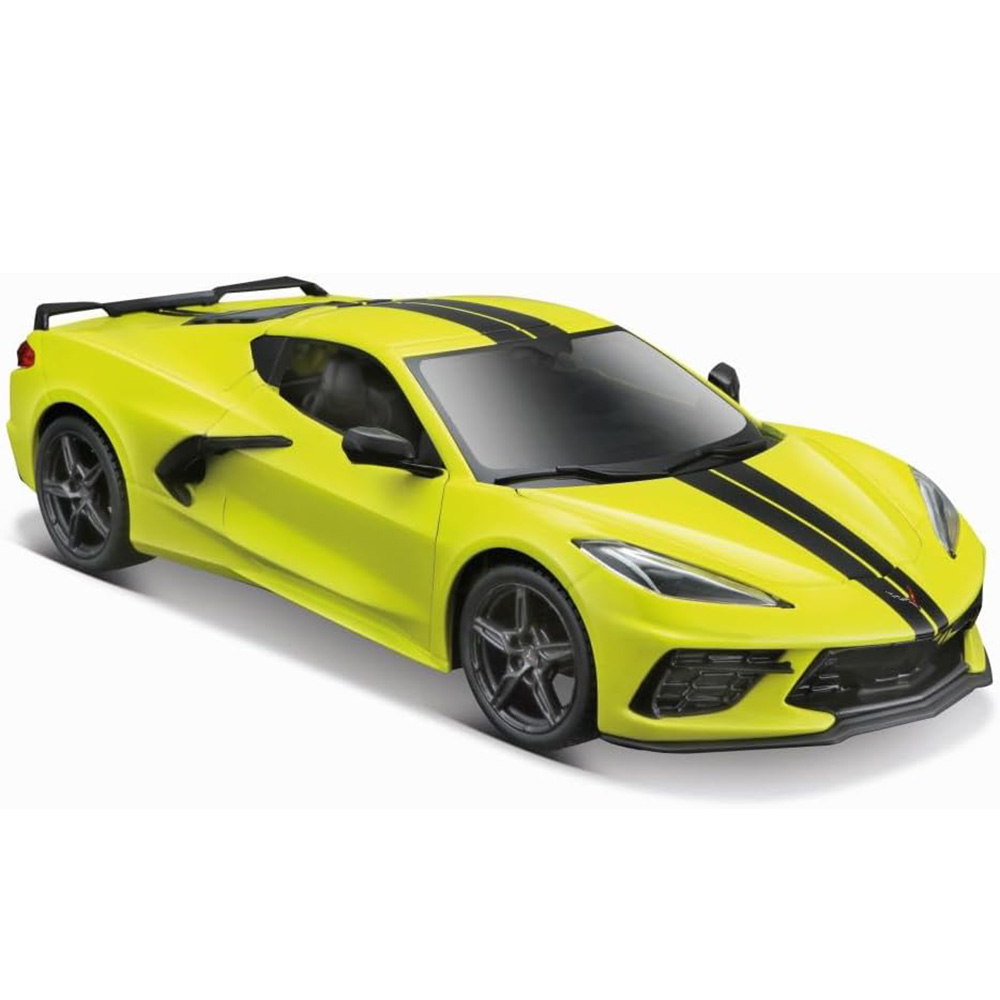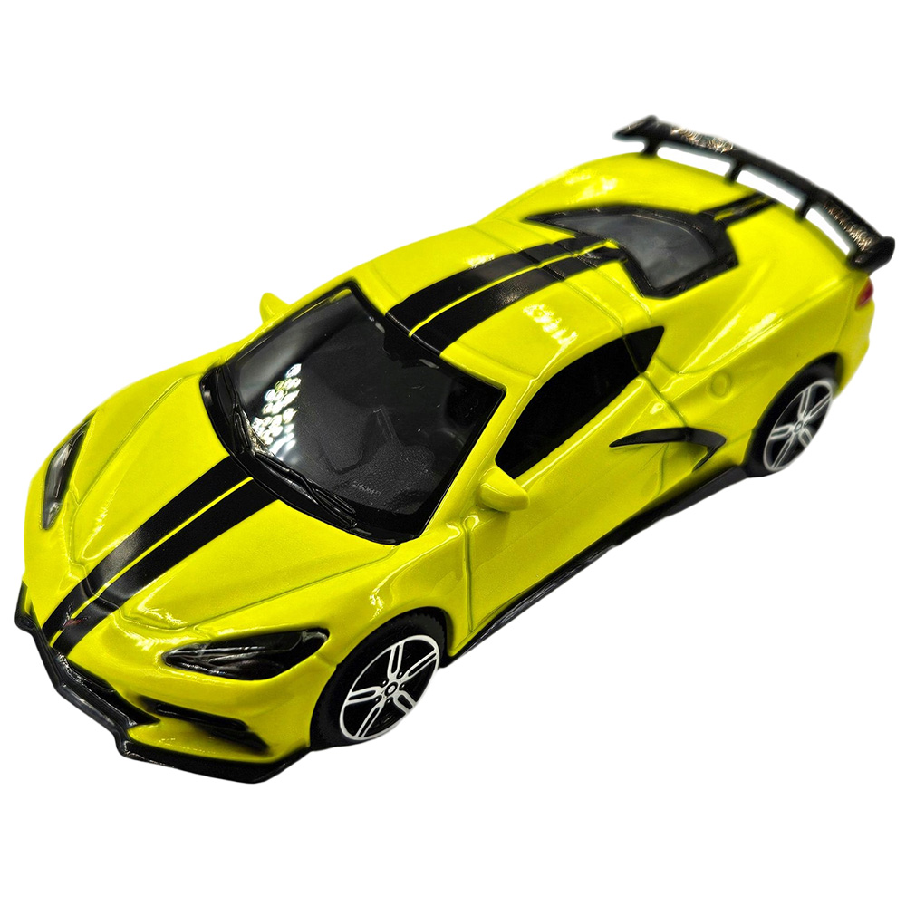 Model samochodu Chevrolet Corvette Stingray Coupe 2020. Pojazd posiada metalową karoserię i plastikowe elementy (szyby, koła, podwozie). Auto w skali 1:43, wykonane z dbałością o szczegóły.