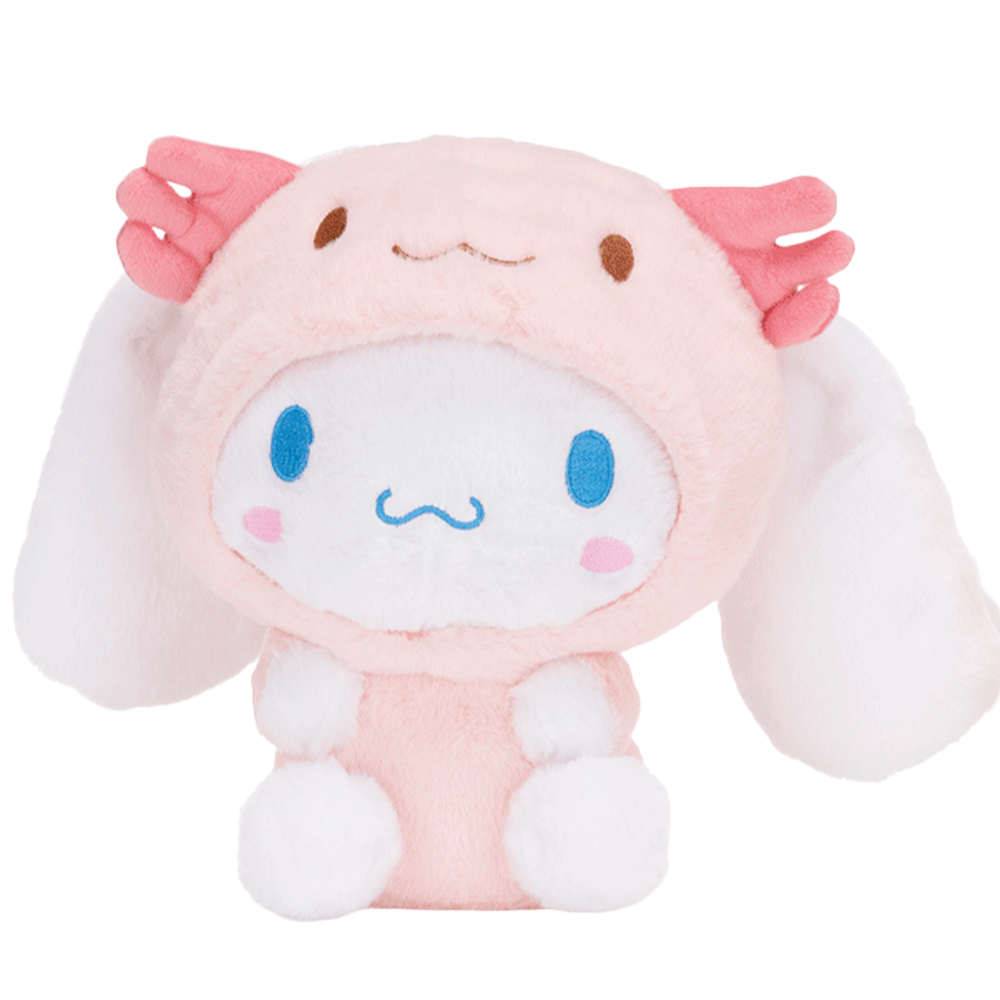 Puchata maskotka Cinnamoroll w stroju Aksolotla (strój nie jest ściągany). Zabawka jest wykonana z bardzo miękkiego i miłego w dotyku materiału z dłuższym włosiem. Cinnamoroll ma wyszywane elementy twarzy, z tyłu ma zakręcony ogonek. Świetny pomysł na prezent dla fanki lub fana serii Hello Kitty.