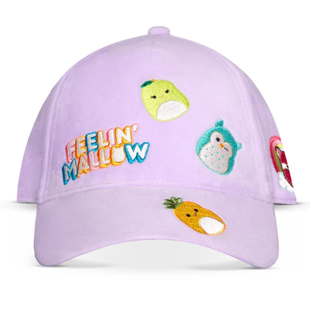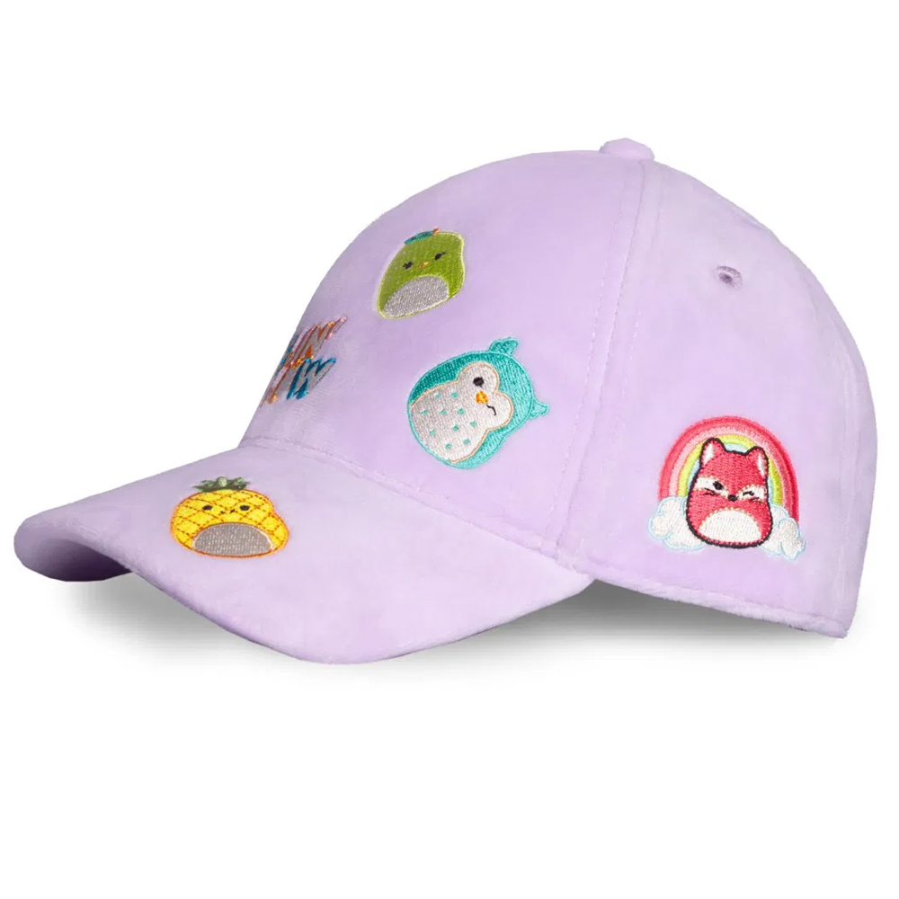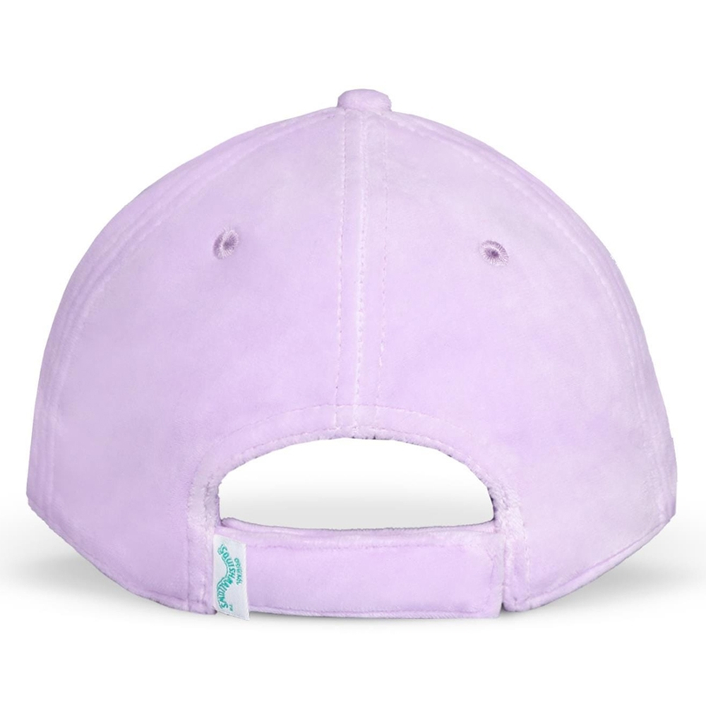 Miękka czapka z daszkiem w fioletowym kolorze z serii Squishmallows. Zewnętrzna strona wykonana z pluszowego materiału – miękka w dotyku, wraz z haftowanymi elementami i usztywnianym daszkiem. Wnętrze wykonane z cienkiej tkaniny.