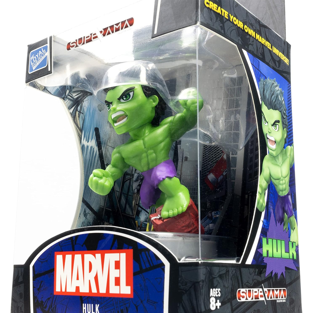 Kolekcjonerska figurka Hulk Marvel Superama. Odwzorowana z dbałością o szczegóły, oferowana na stojaku kolekcjonerskim w scenerii zniszczenia. Figurka wykonana z mocnego, trwałego tworzywa. Zapakowana w kolorowe opakowanie, nadające się na prezent.