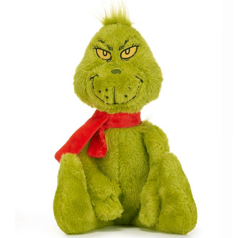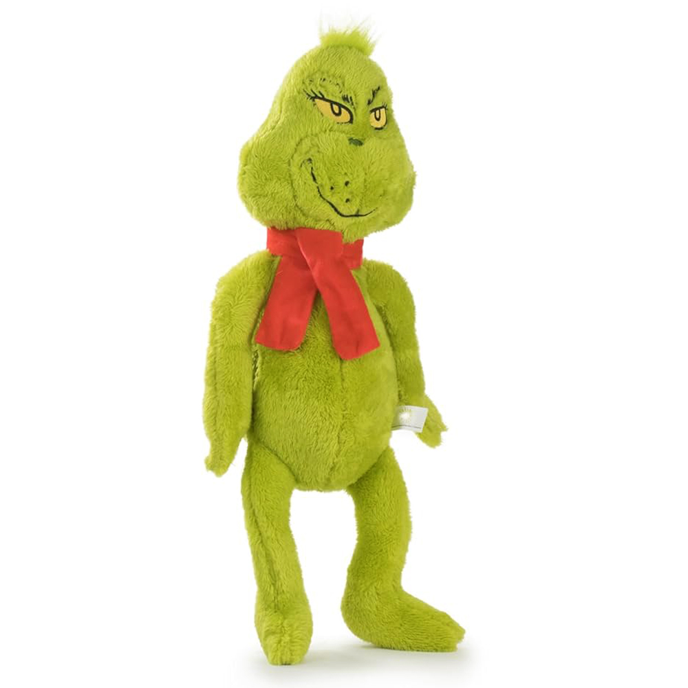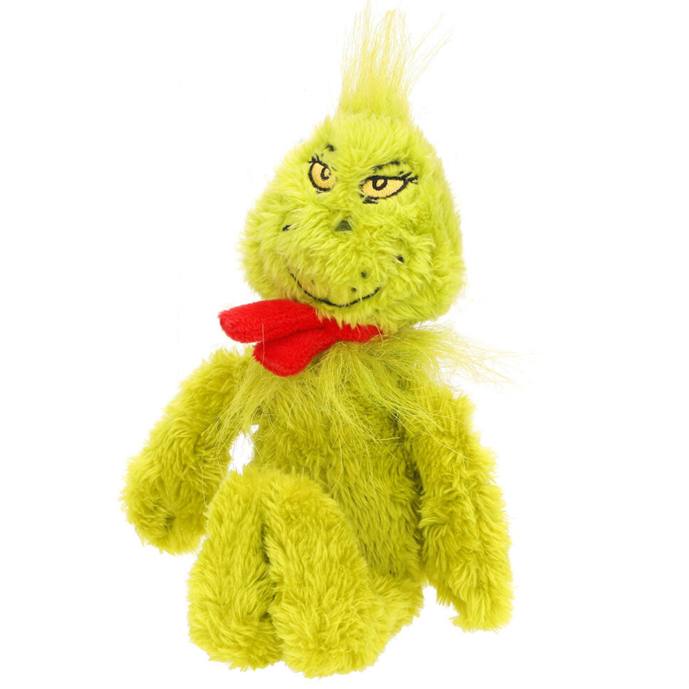 Maskotka Grinch wykonana z miękkiego materiału z dłuższym włosiem. Ma wyszywane elementy twarzy. Grinch ma przyszyty czerwony szalik.