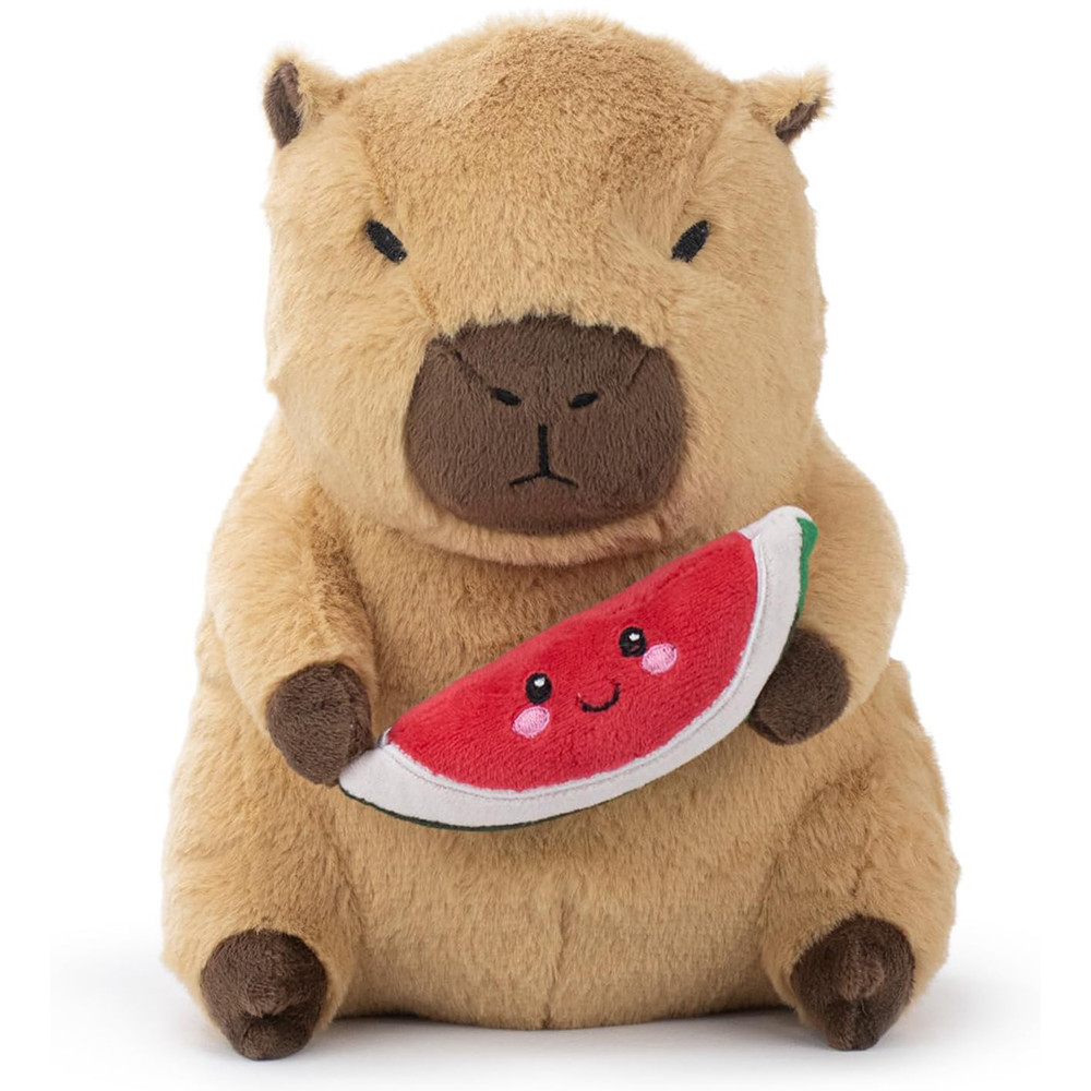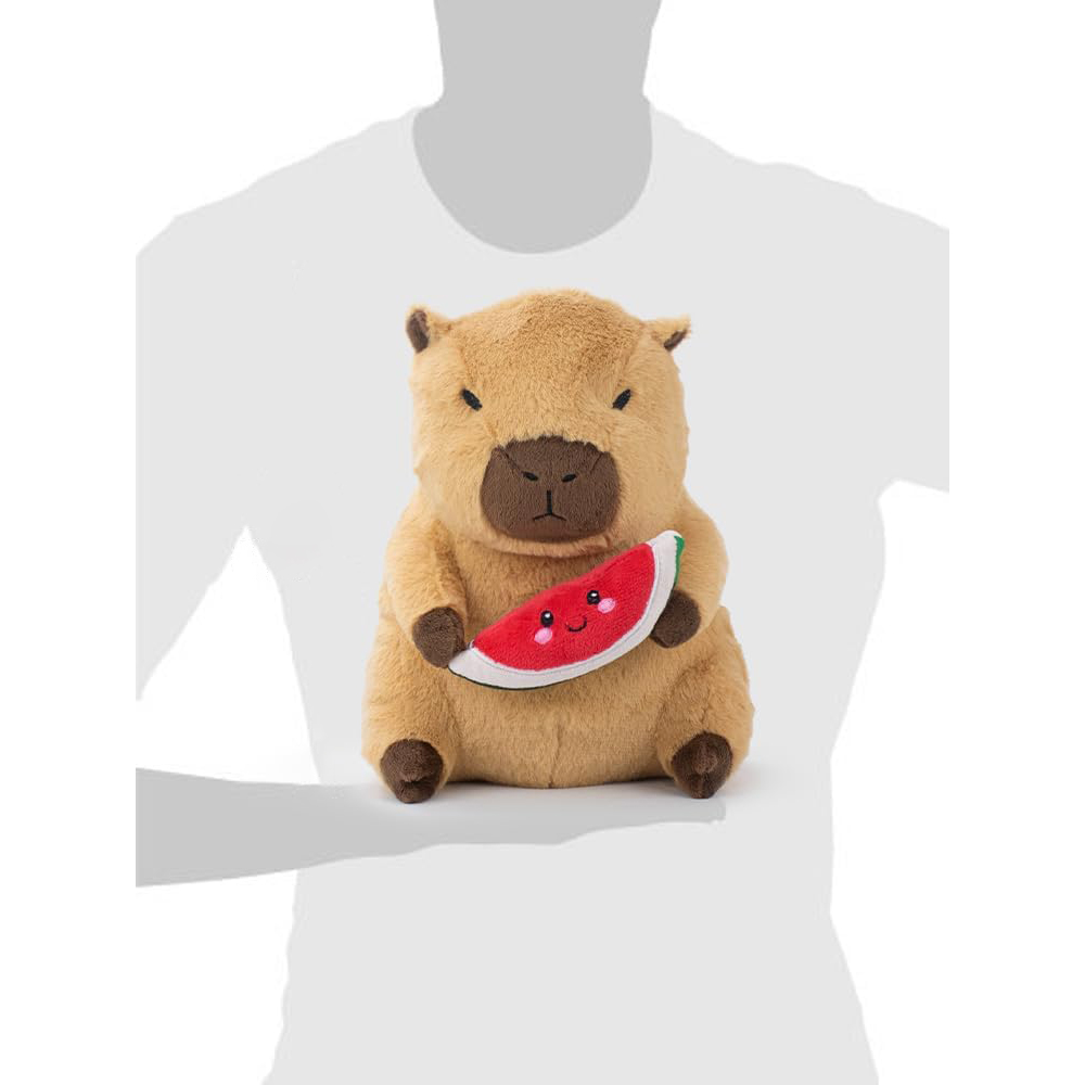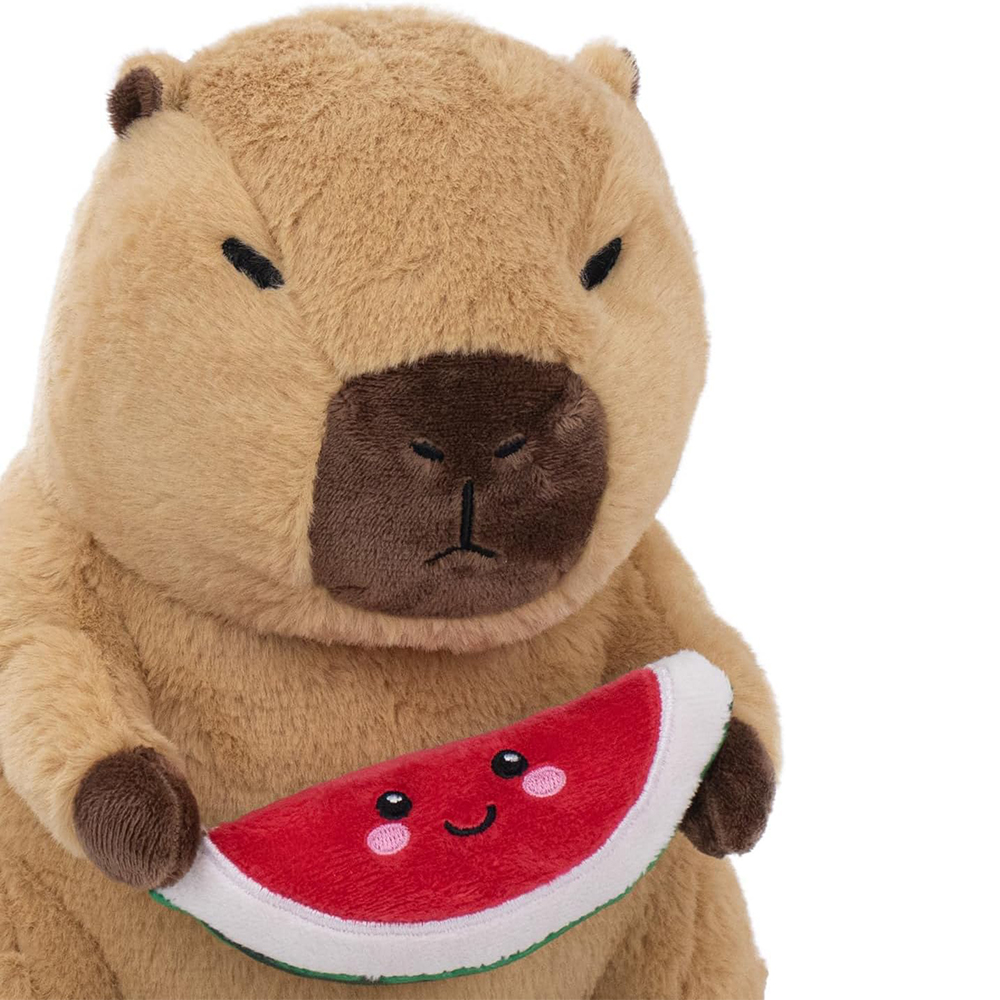 Pluszak Kapibara z arbuzem. Wykonany z dbałością o szczegóły, aby świetnie odwzorować zwierzę. Materiał wysokiej jakości, jest bardzo miękki i miły w dotyku. Zabawka dobrze wypełniona pluszem. Arbuz jest pluszowy.