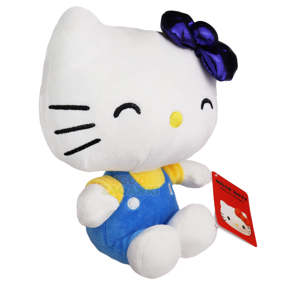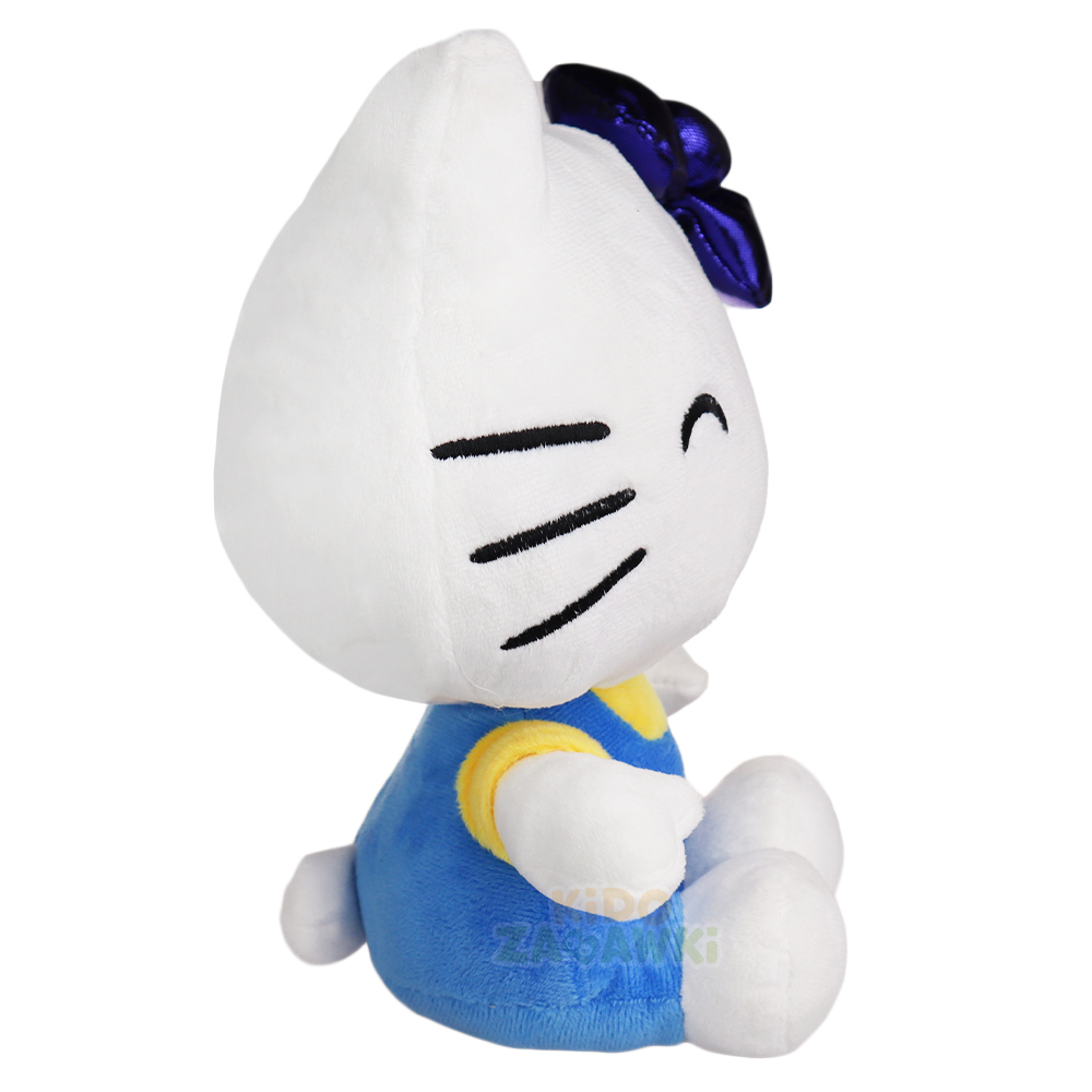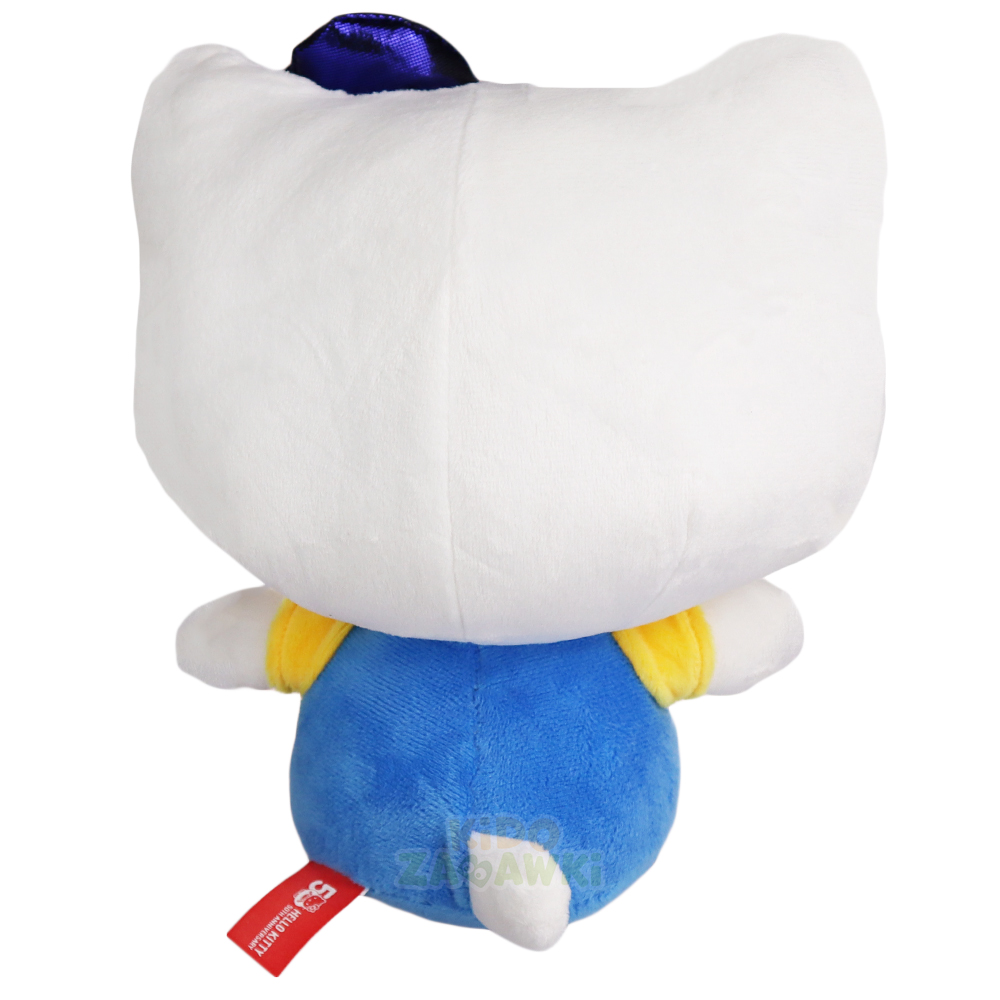 Oryginalna maskotka Hello Kitty w granatowych ogrodniczkach, wykonana z dokładnością, dobrze wypełniona miękkim pluszem.