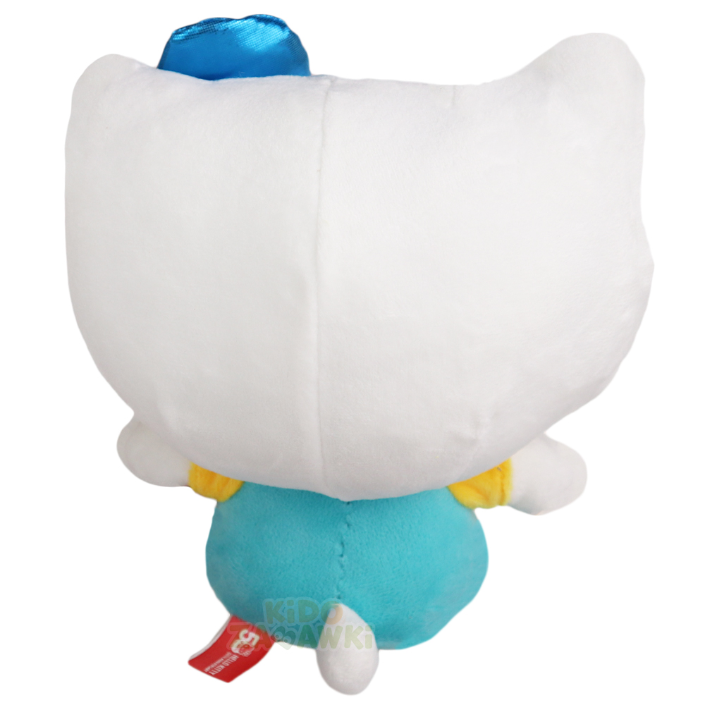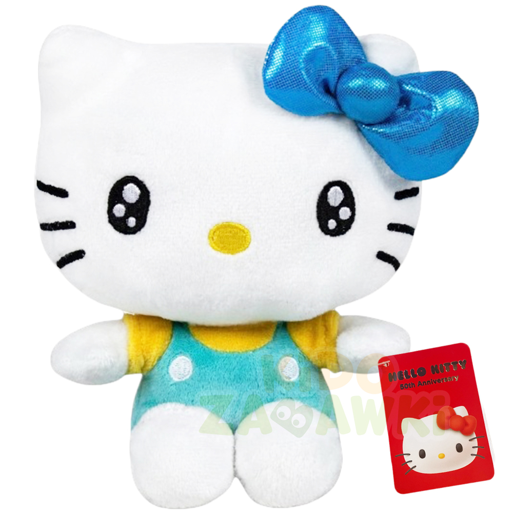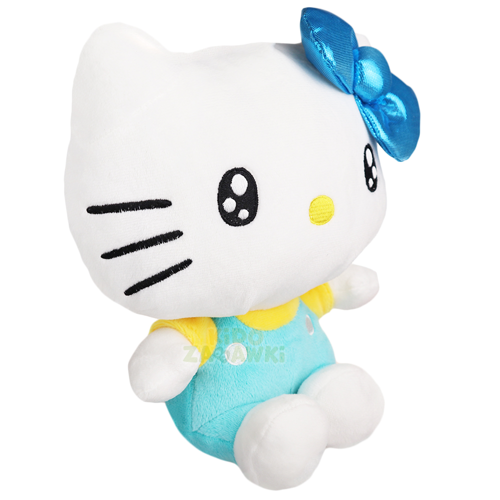Oryginalna maskotka Hello Kitty w turkusowych ogrodniczkach, wykonana z dokładnością, dobrze wypełniona miękkim pluszem.