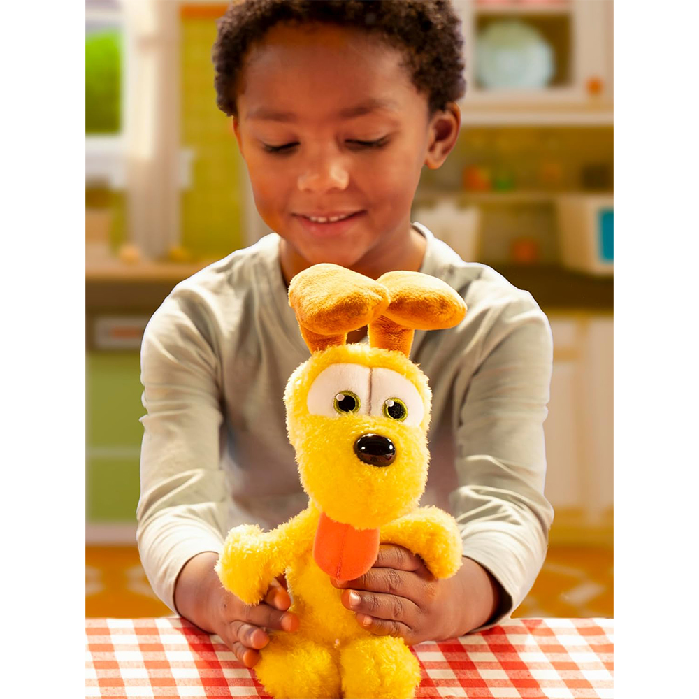 Maskotka pies Odie z filmu Garfield Movie. Wykonana z dbałością o szczegóły, bardzo miękka, z włochatego materiału, przyjemna w dotyku – idealna do przytulania. Zabawka jest dobrze wypełniona pluszem, ma wyszywane oczy i twardy nosek.