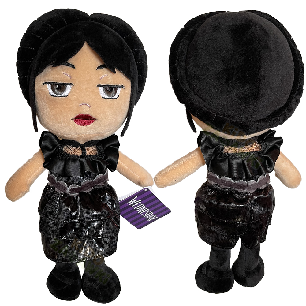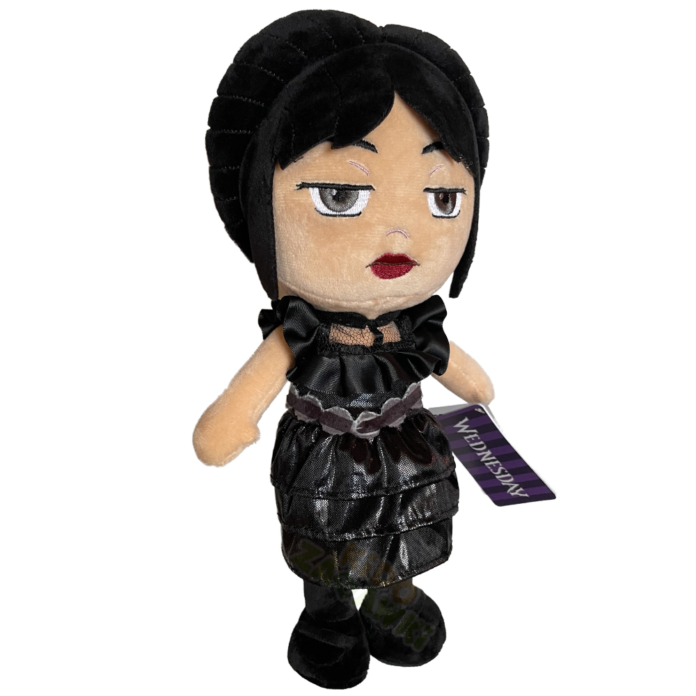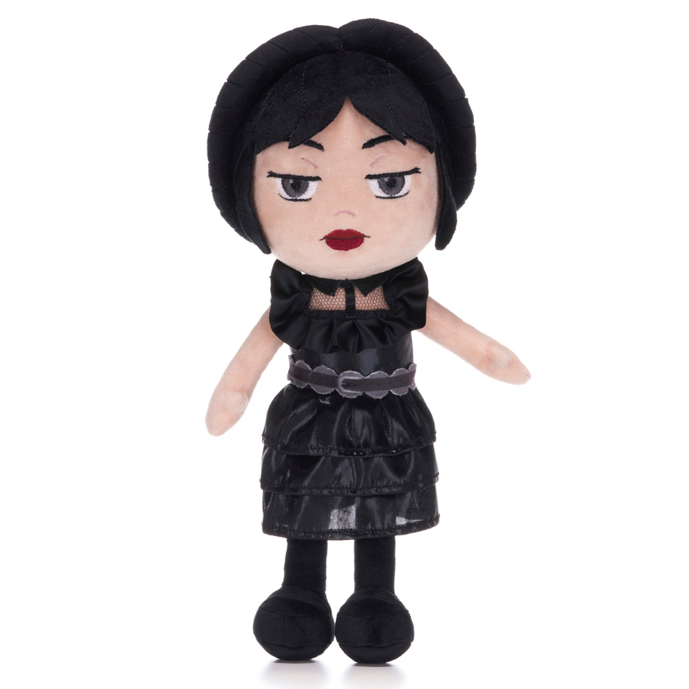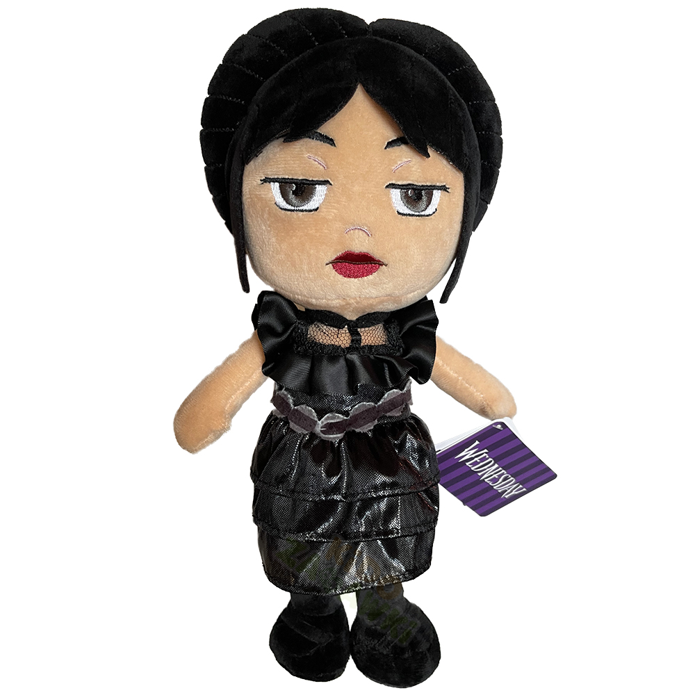 Wednesday w sukni balowej, ma wyszywane elementy twarzy. Maskotka nie stoi samodzielnie, można ją sadzać.