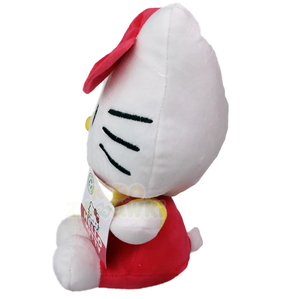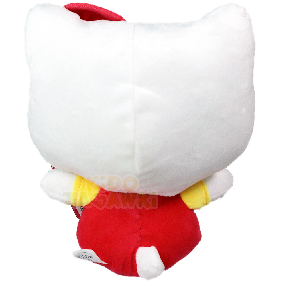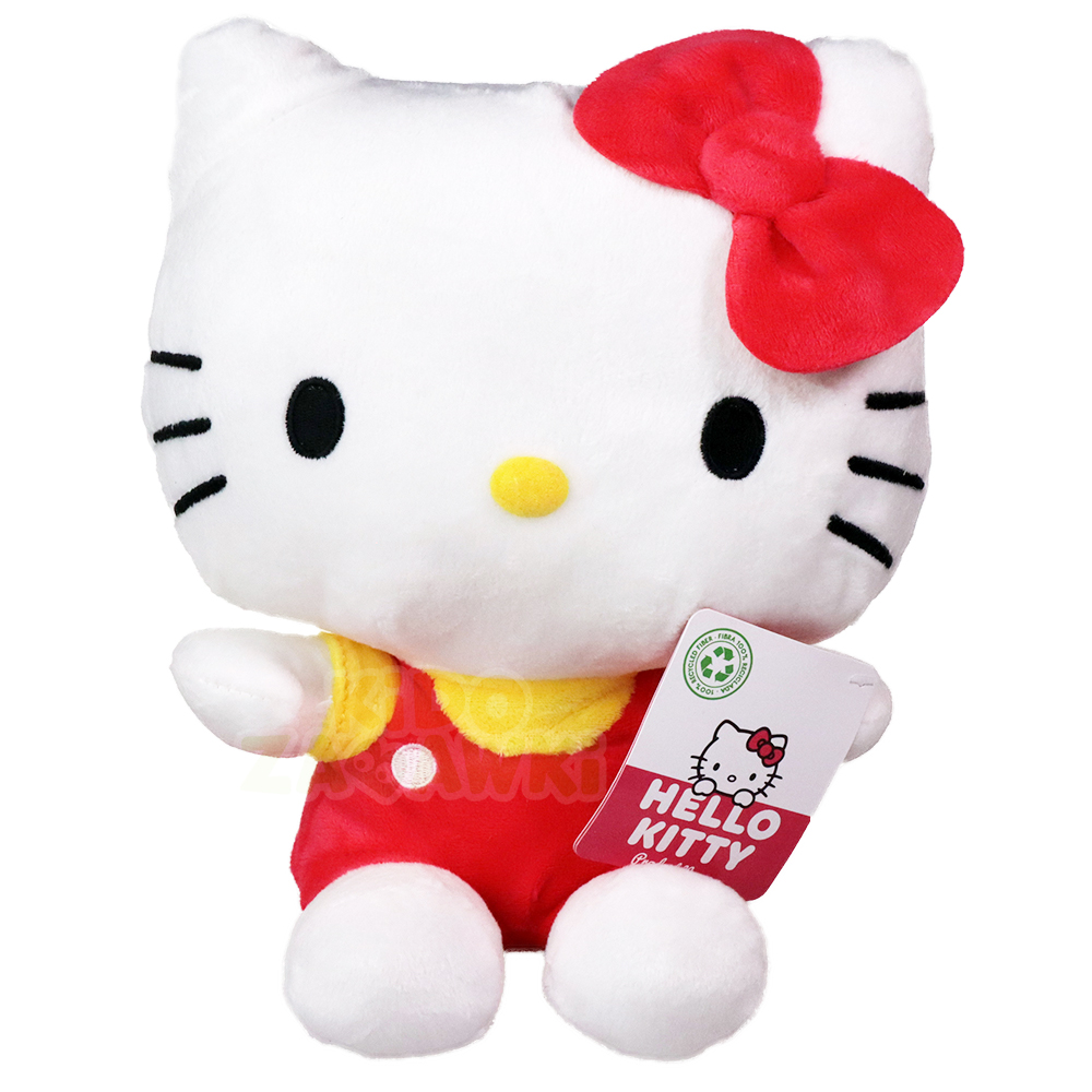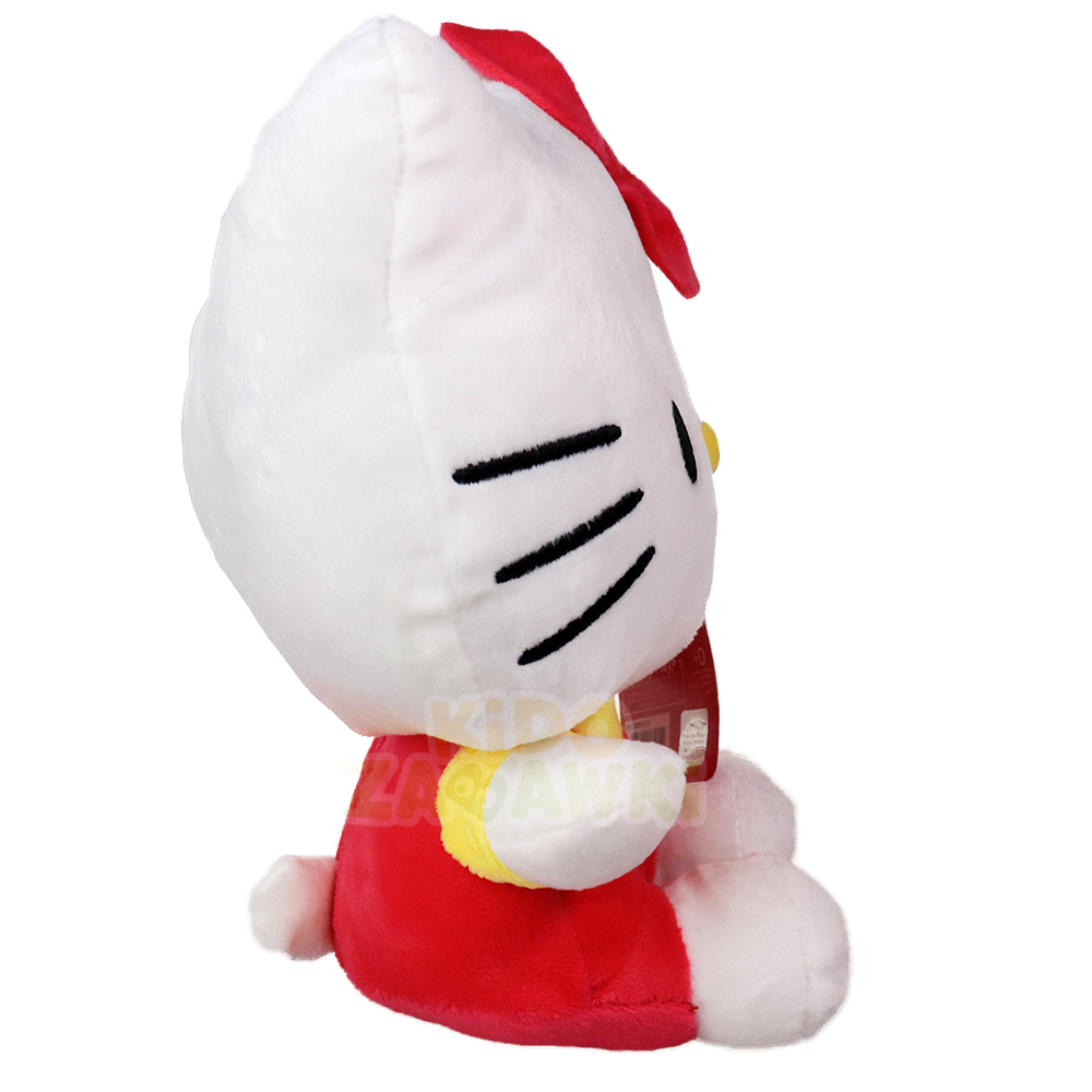 Oryginalny Pluszak Hello Kitty w czerwonych ogrodniczkach, wykonany z dbałością o detale, dobrze wypełniony miękkim pluszem.