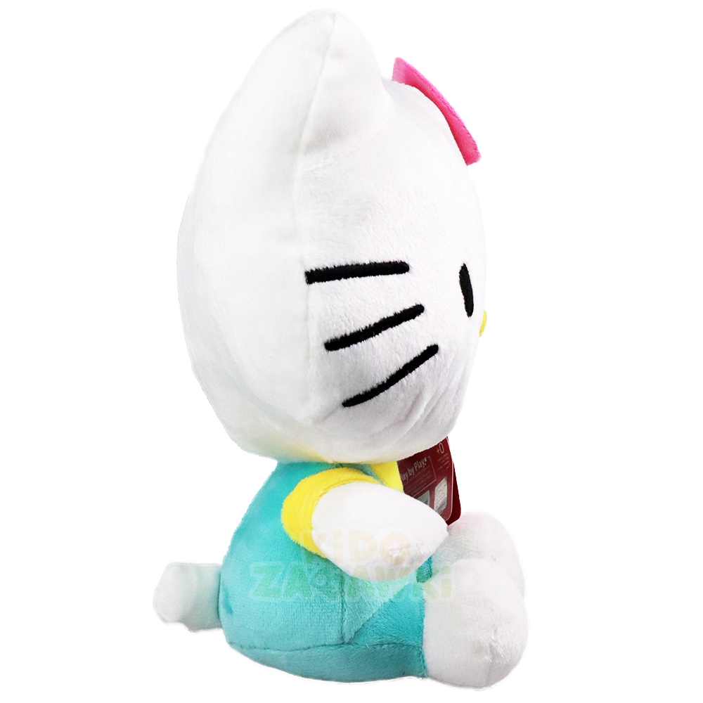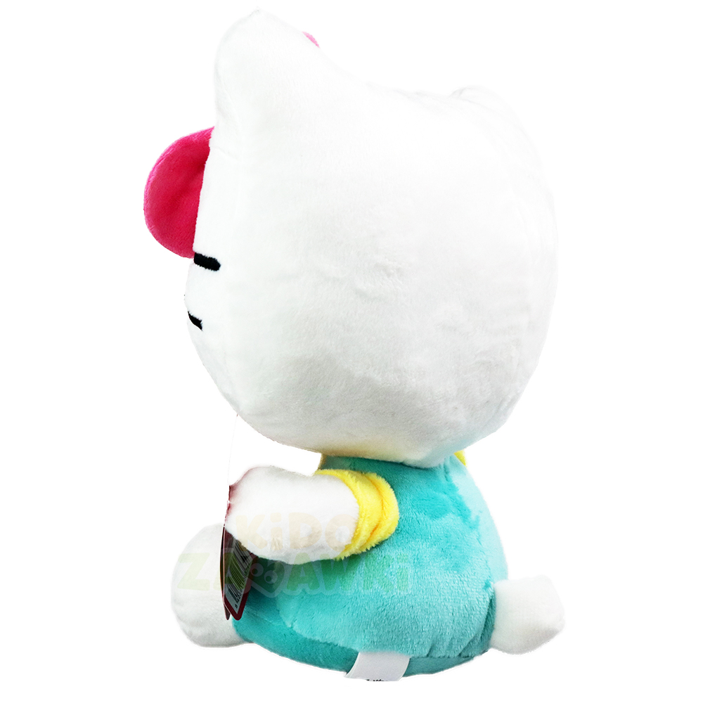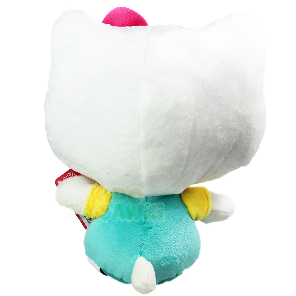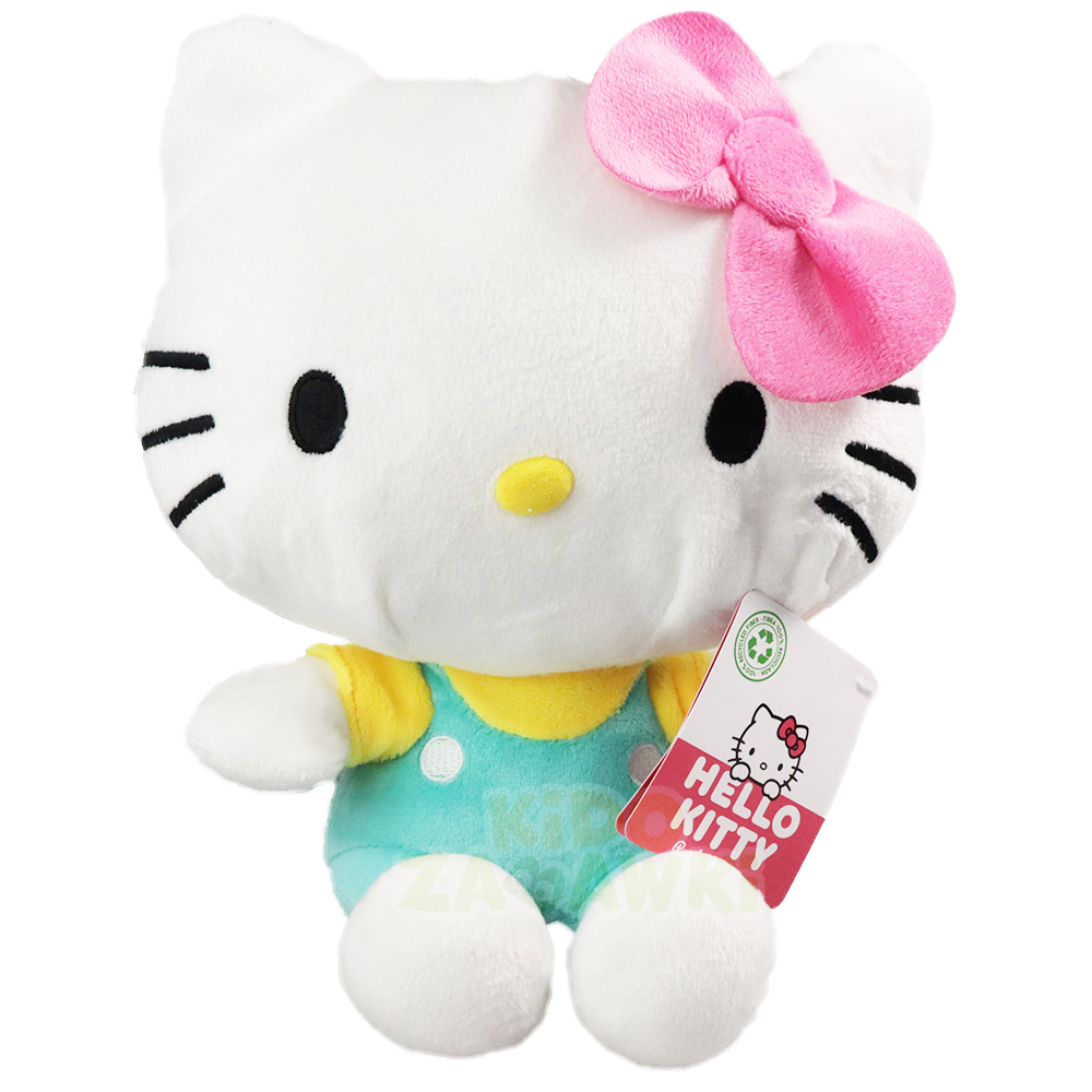 Oryginalny pluszak Hello Kitty w turkusowych ogrodniczkach, wykonany z dbałością o detale, dobrze wypełniony miękkim pluszem.