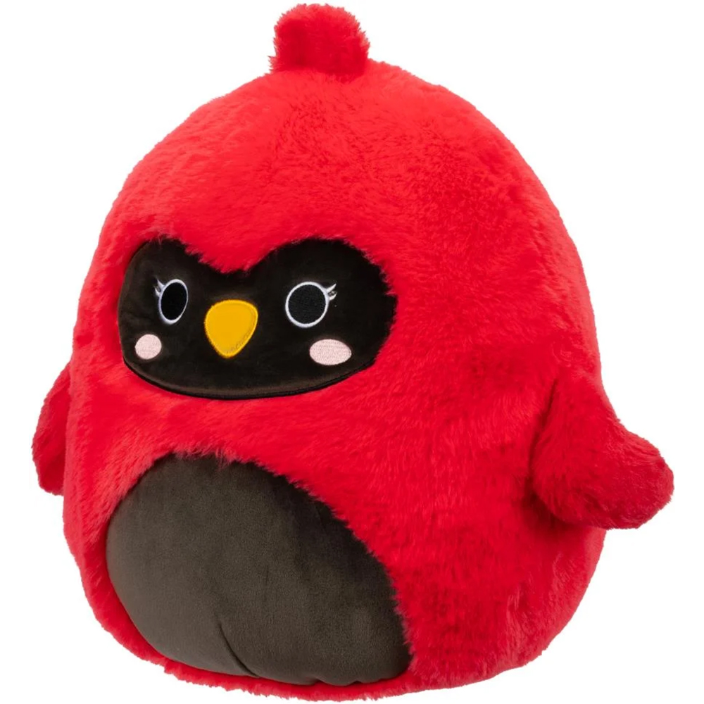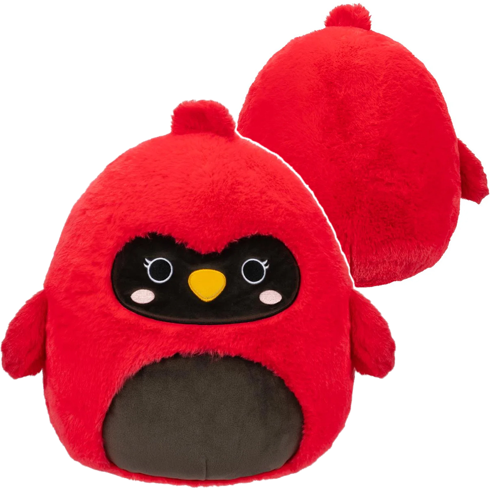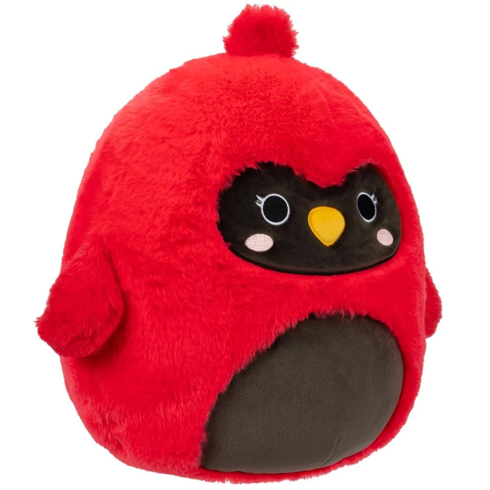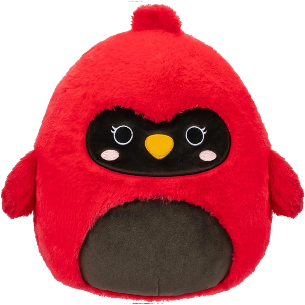 Squishmallows Cazlan to czerwony ptak z czarną maską i brzuchem. Jego okrągłe, czarne oczy są otoczone białymi obwódkami i dwoma krótkimi rzęsami na każdej. Ma trójkątny, żółty dziób i różowe rumieńce na policzkach. Ma puszystą, ciemnoczerwoną kępkę na czubku głowy i skrzydła po obu stronach brzuszka .Maskotka ma około 30 cm wysokości i jest wykonana z bardzo miłego materiału z długim włosiem (specjalna wersja Fuzzamallows!).
